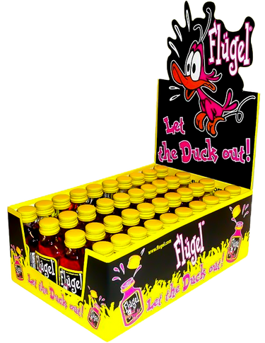 Flügel er det evigt populære partyshot i den ikoniske, lille flaske med den selvlysende and. Hvis dine tanker straks begynder at vandre mod afterski og tyrolermusik er du ikke ene; det søde vodkashot med smag af søde bær og energidrik er mere eller mindre fast inventar på afterski-barer, men den er naturligvis en populær gæst til de fleste fester. Faktisk er den så populær, at fans har opfundet et helt ritual til indtagelse af shottet: